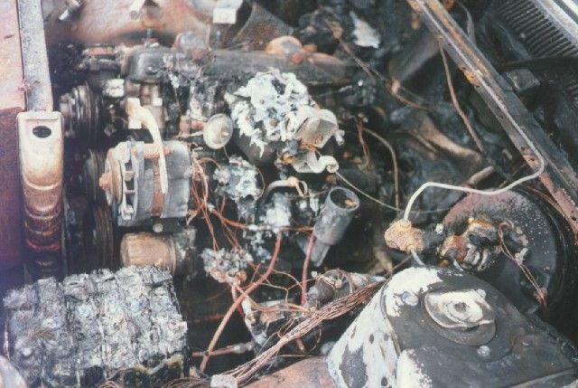 Der ausgebrannte Motorraum nach dem Brand durch Backfire.