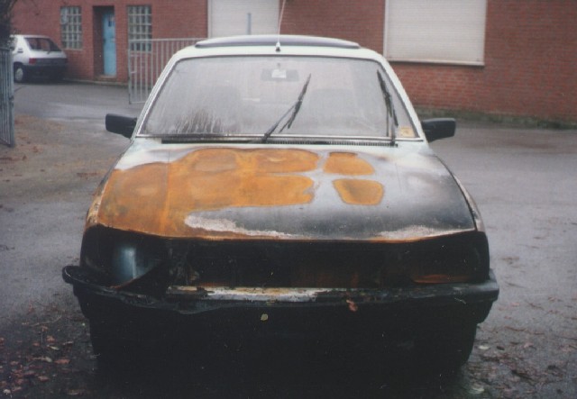 Scheinwerfer und Reifen sind durch die Hitze regelrecht zerplatzt. Sämtlicher Kunststoff verbrannt und das entlackte Blech oxidi