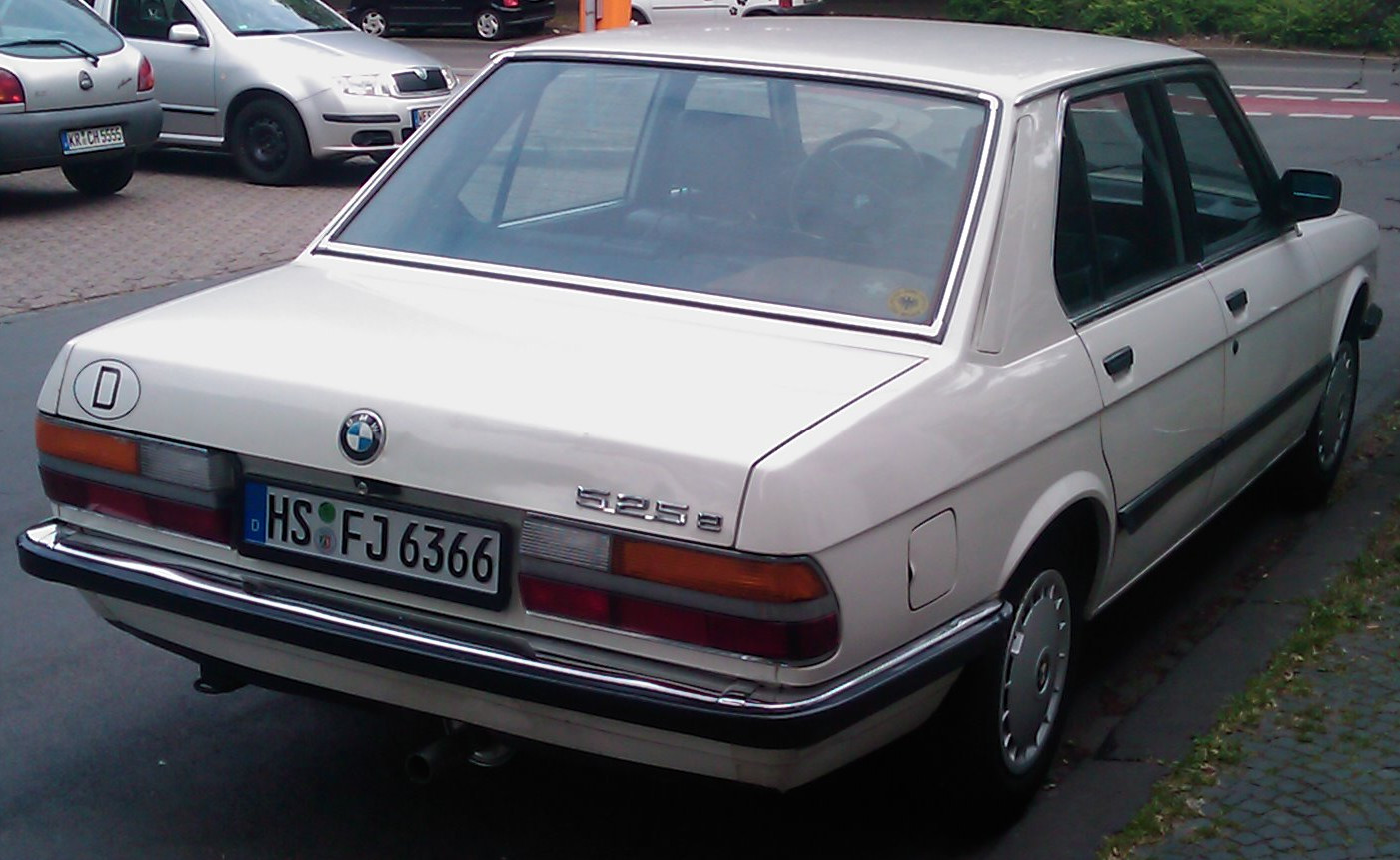 Die Heckpartie des E28 baut gegenüber dem E12-Vorgänger etwas höher und bulliger. Zur weissen Lackierung passen die Chromleisten der Heckleuchten auch sehr schön.